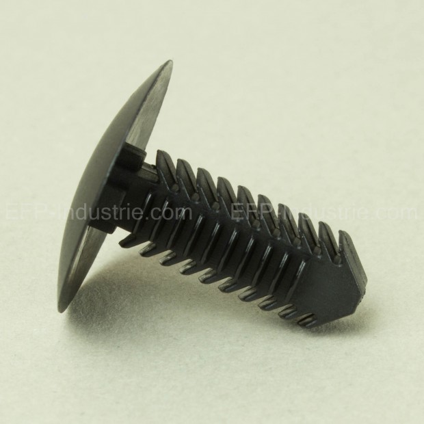 Ce rivet sapin s’installe par une simple pression dans un trou. Les ailettes plastiques présentent se déforment lors de l’insertion pour assurer une bonne tenue du rivet plastique. Cette action va fixer le rivet de manière permanente, et offrira un très bon maintien du matériel ou plaques utilisées. Couramment utilisé dans l’automobile pour la fixation des mousses et revêtement.